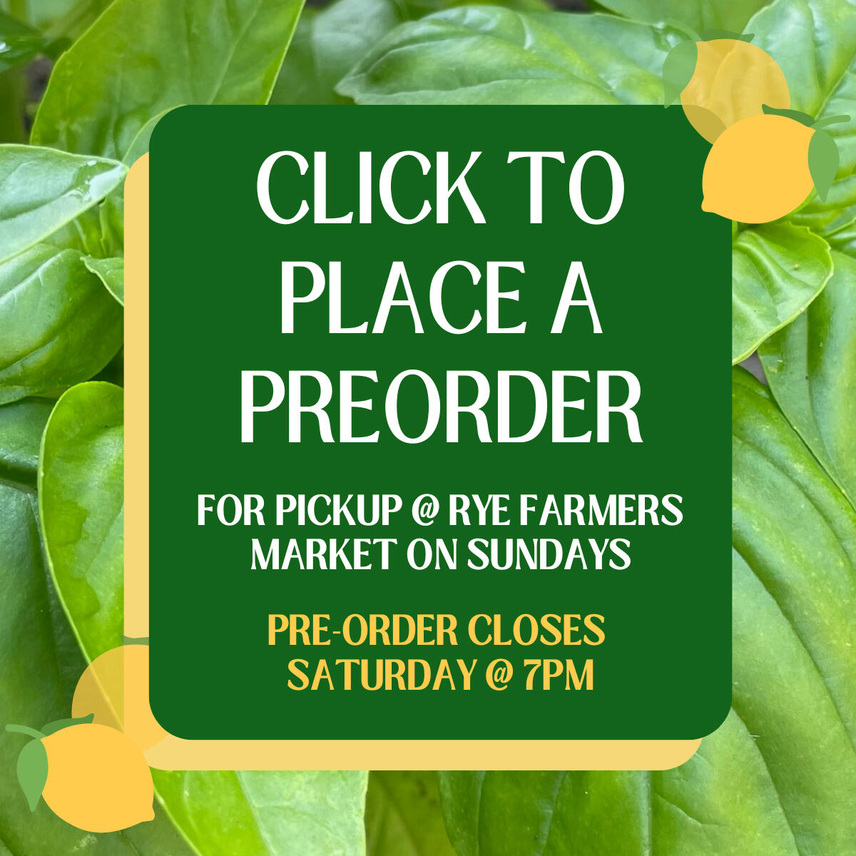 Don't miss out on your faves - place a preorder in advance!Each week we're at the Rye market, customers can place a preorder up until 7pm the night before to reserve their favorites. Just click the button to the right to place your order, and come find us at the Rye Market for pickup any time between 8:30am-12:30pm.Hope to see you soon!